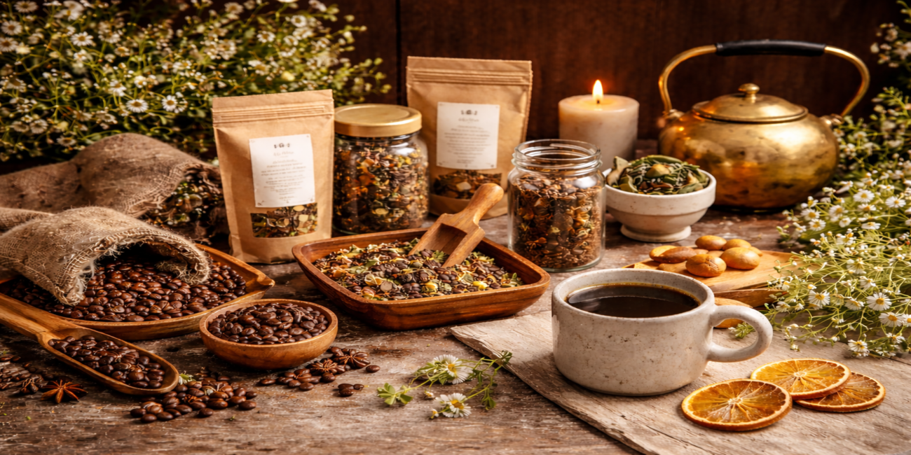 Thés, tisanes et cafés artisanaux, assemblés avec soin pour accompagner vos moments du quotidien.