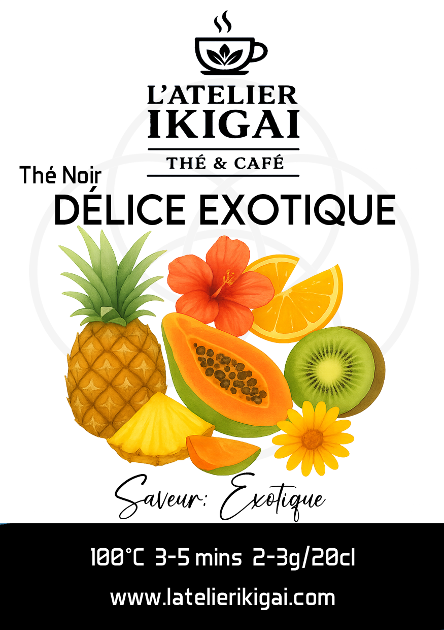 Délice Exotique est un thé noir fruité et généreux, inspiré des saveurs tropicales. En infusion à froid, il offre une tasse fraîche et équilibrée, où les fruits s’expriment avec douceur, sans amertume.