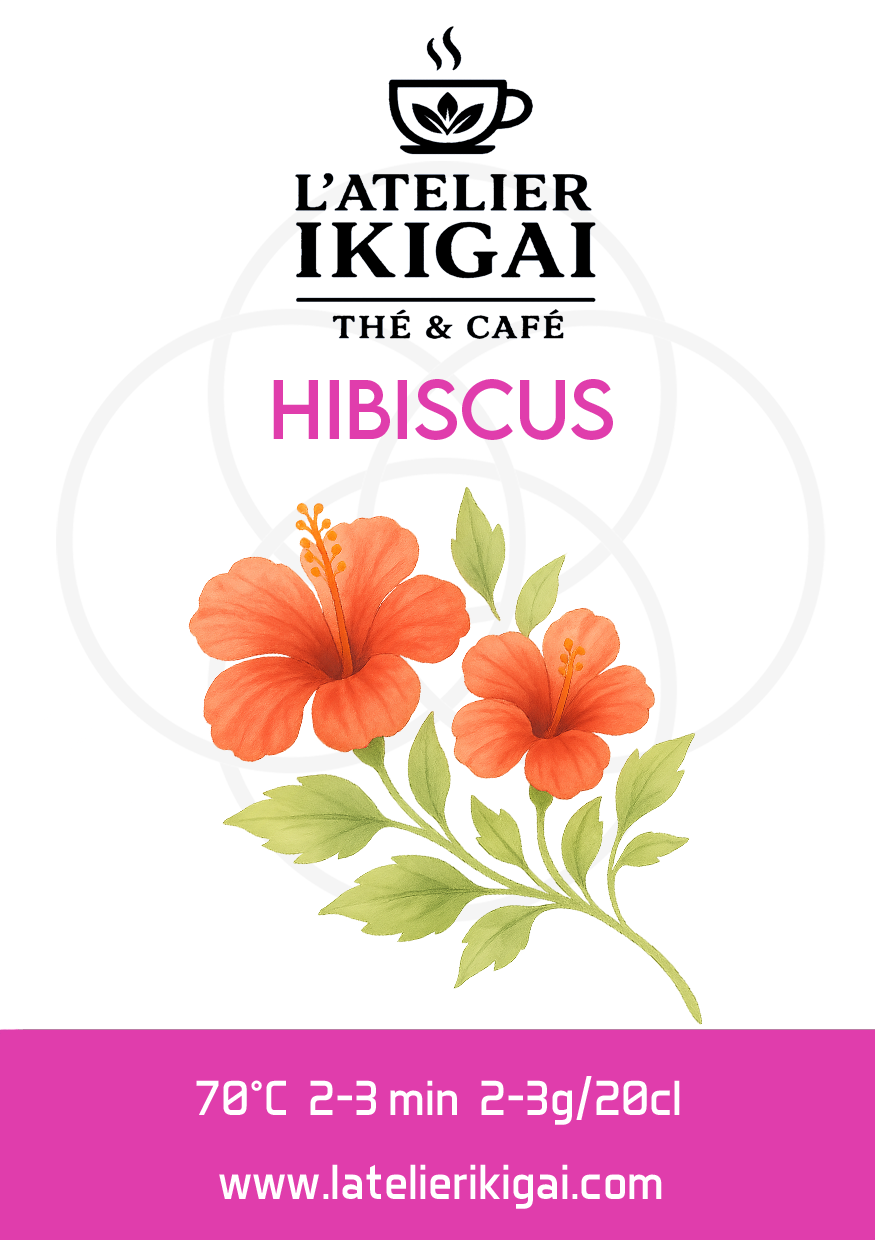 Les fleurs d’hibiscus offrent une infusion intense et naturellement acidulée. Leur couleur profonde et leur fraîcheur en font une boisson désaltérante, particulièrement appréciée en infusion à froid.